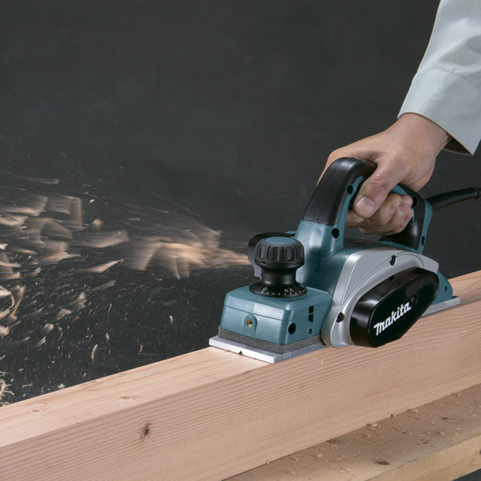 The Makita 82 mm (3-1/4") 620 W planers, planes up to 82 mm (3-1/4") wide and 2.5 mm (3/32") deep in a single pass. High power-to-weight ratio; lightweight, 620 W motor delivers more output power for increased stock removal and superior finishes and two-blade cutter head with 17,000 RPM delivers smooth finish and fast stock removal.Equipped with double edge carbide blades for added performance and easy blade setting system for fast blade installation