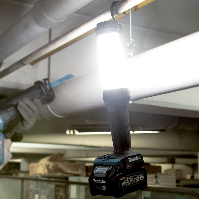 The Makita 40Vmax XGT Li-Ion 21 LED Worklight, 710 Lumens. USB power supply switch with auto-off function for saving battery power. Built-in USB port for charging portable electronic devices is equipped with a rubber cap to minimize ingress of dust and debris. Extreme Protection Technology (XPT) is engineered to provide increased dust and water resistance in harsh job site conditions. Lightweight for reduced outdoor & power equipmentrator fatigue. Metal hang hook swivels 360° and folds away for added convenience .