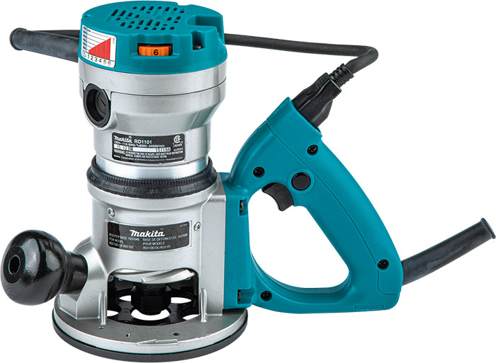 The Makita 2-1/4 HP D-Handle routers (RD1101) combines power with convenience and ease-of-use features for improved performance. The RD1101 has a powerful 11 AMP motor with soft start for smoother start-ups, and electronic speed control that maintains constant speed under load. The variable speed control dial allows the user to match the speed to the application, with 8,000 - 24,000 RPM. Comfort and ease-of-use features include an industrial cam-lock for fast and easy depth adjustment and removal of the motor, lower vibration, and lower noise (only 81 dB). The RD1101 is engineered with all-ball bearing construction for longer tool life and accepts 1/2" and 1/4" shank bits.